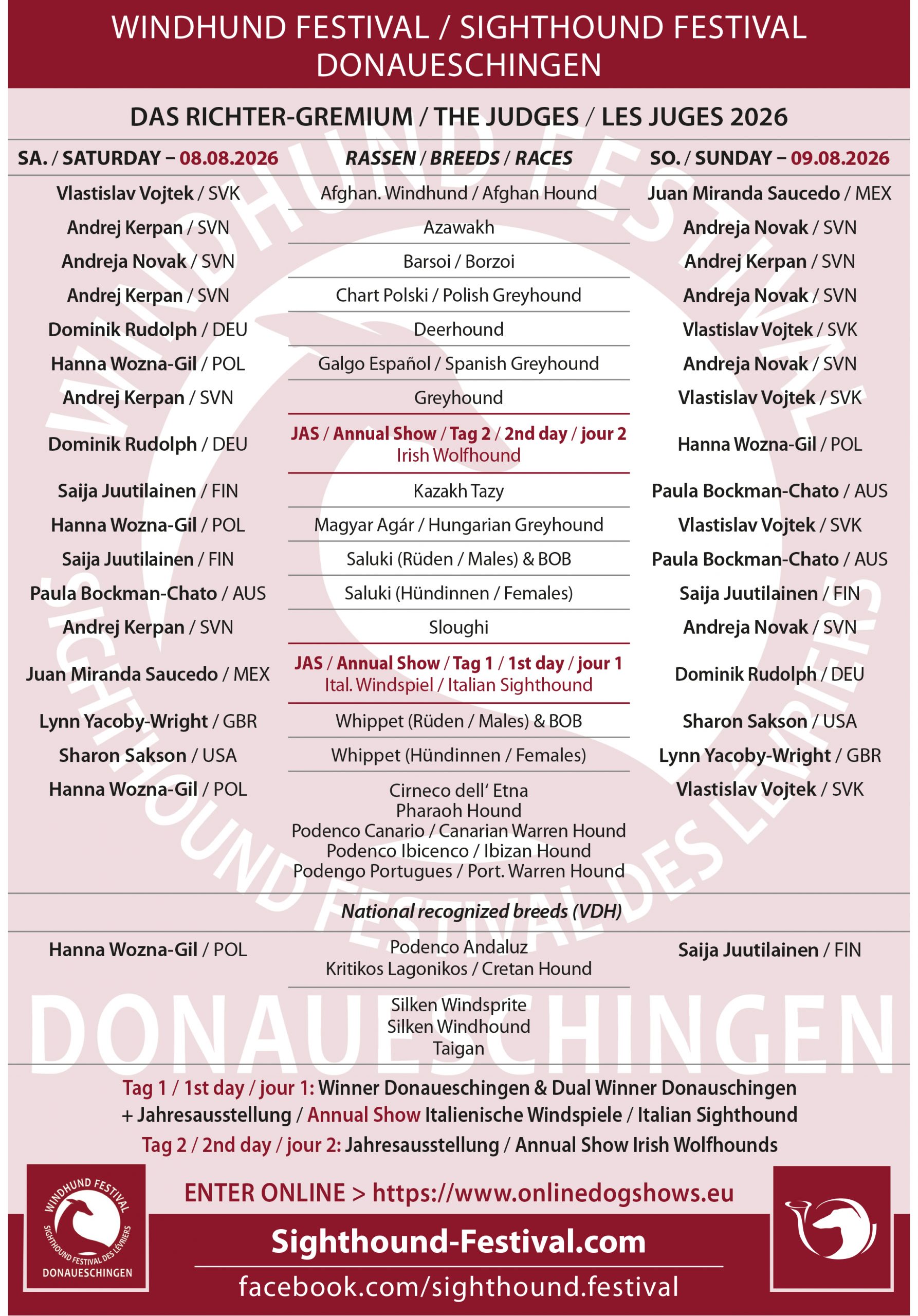 herzlichen Dank für die Einladung, die Italienischen Windspiele und die Irischen Wolfhunde beim Windhundfestival Donaueschingen am 8. und 9. August 2026 zu richten.